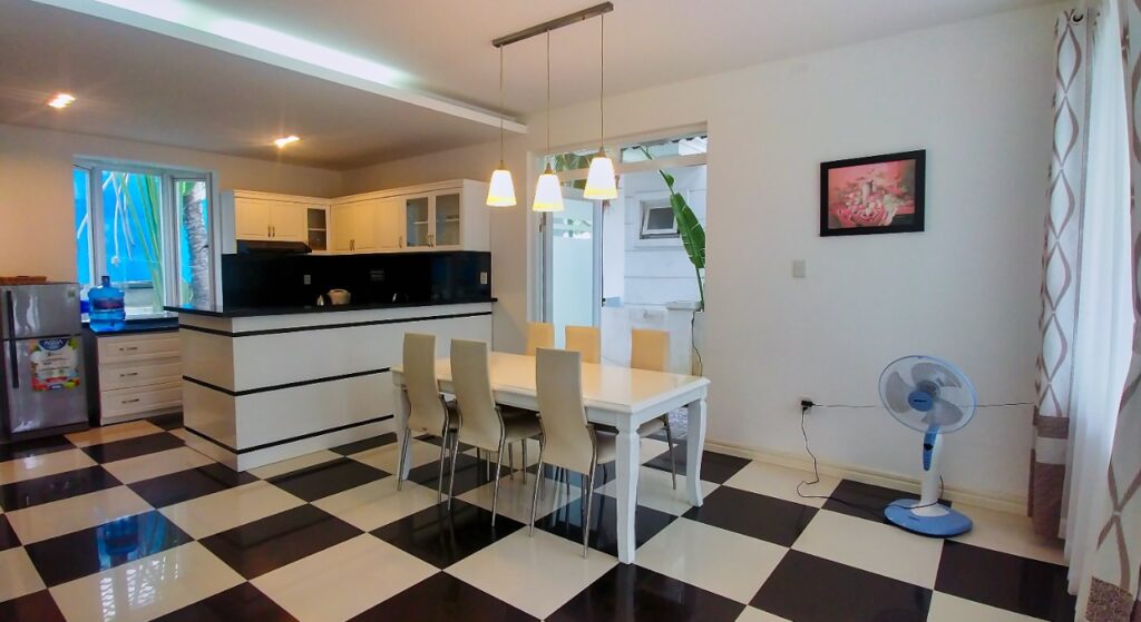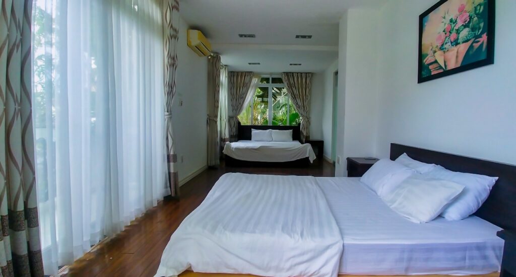 - 5 phòng ngủ, 6 giường, 1 phòng khách, 1 phòng bếp với đầy đủ trang thiết bị như tivi, điều hòa, tủ lạnh, bếp nấu, dụng cụ nấu, lò vi sóng,… Villa phù hợp cho đoàn gia đình, bạn bè khoảng 10-15 người