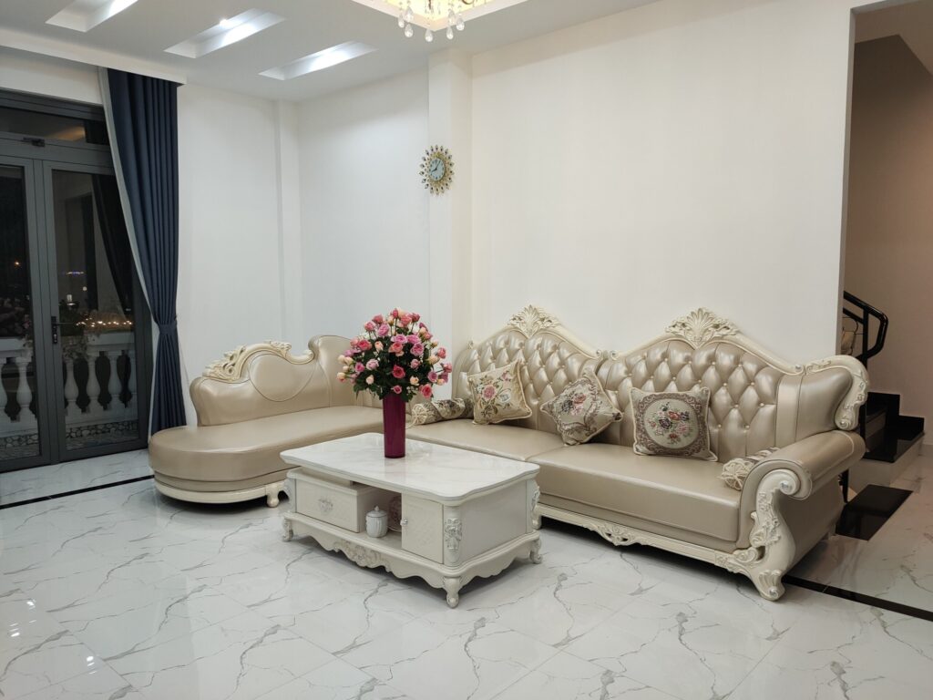 – Phòng khách hiện đại cao cấp: ghế sofa, tivi, đồng hồ, hoa tươi, máy sấy, bàn ủi