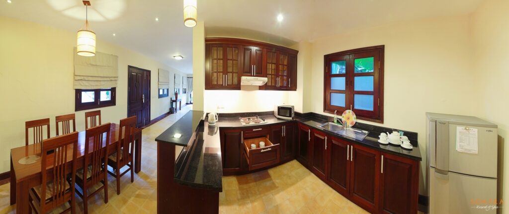 - Bếp: Có các đồ gia dụng: bếp điện, tủ lạnh, bình đun siêu tốc, kệ tủ bếp đựng các chén dĩa, dao, thớt, bộ ấm trà, ly các loại… để phục vụ bữa ăn gia đình.