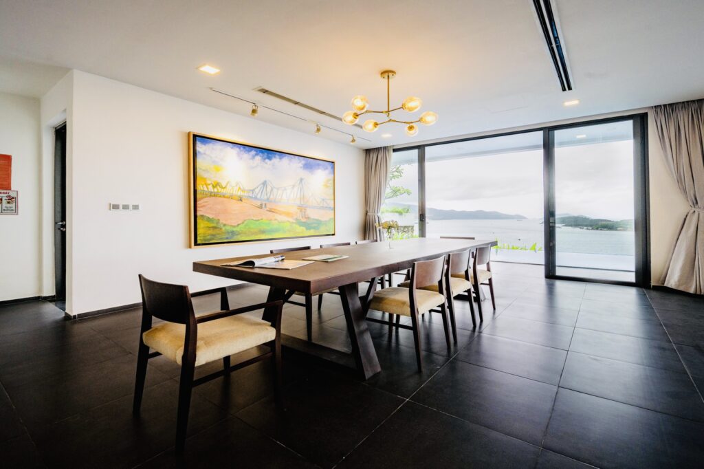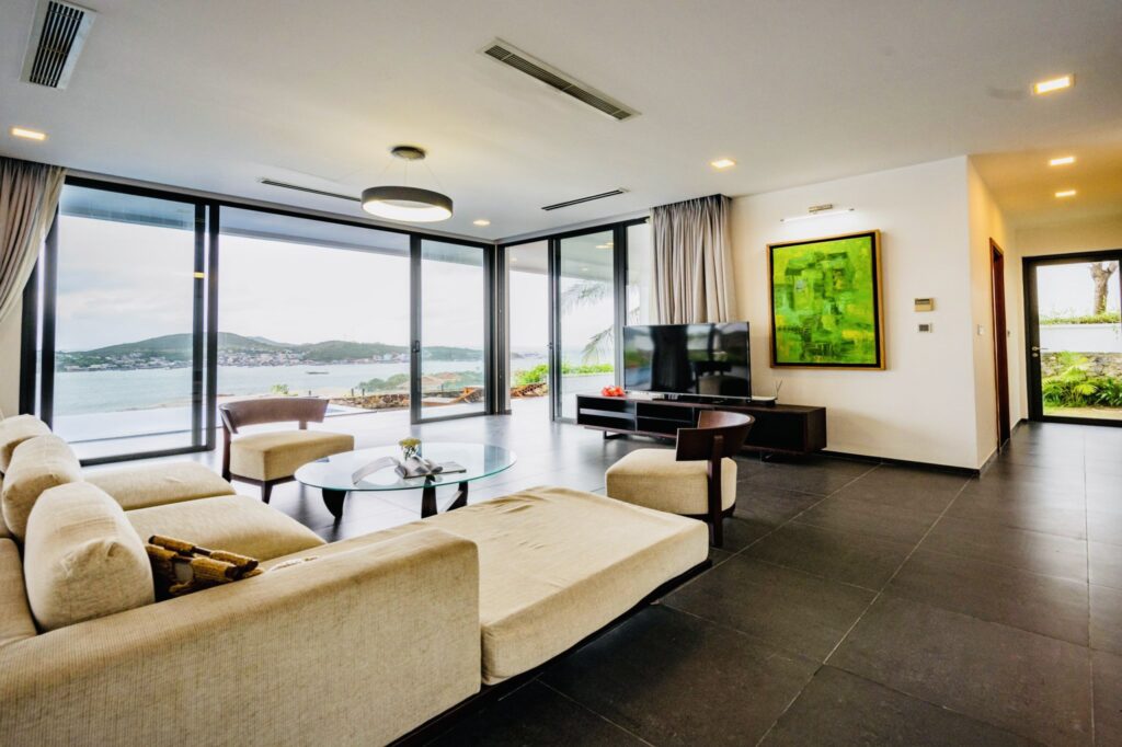 phút đi bộ đến bãi biển. Từ villa đi khoảng 7 km sẽ đến trung tâm thành phố Nha Trang. Villa được trang bị nội thất đầy đủ, bao gồm sofa, bộ bàn ăn, giường ngủ,…