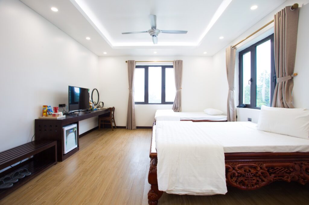 - 10 phòng ngủ kép kín, tivi, điều hòa hai chiều, milibar ( mỗi phòng 2 giường 1.6m x 2.0m).