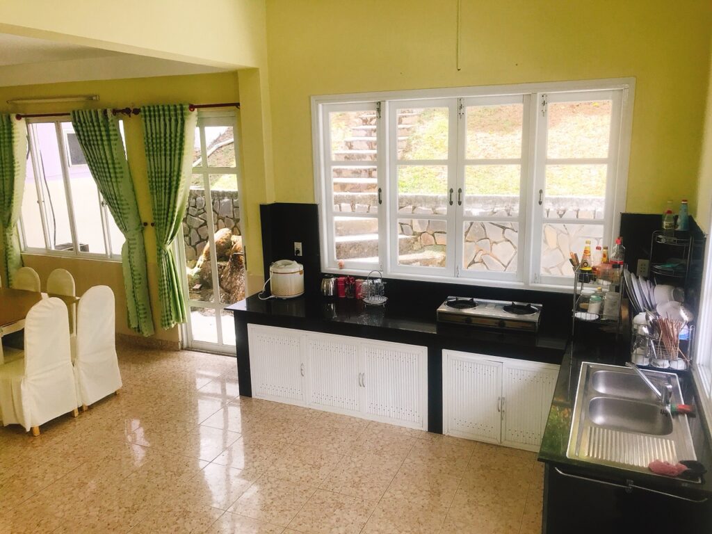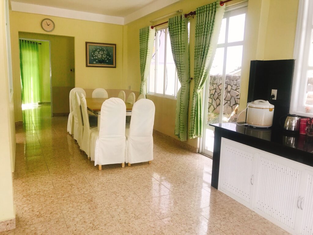 + Villa có bếp, phòng ăn. phòng khách đầy đủ. Có thể nấu ăn tự túc, hoặc đặt nhân viên nấu. Tối có thể làm BBQ, có nhân viên hỗ trợ. Phụ thu tiền ga (nếu nấu ăn) : 50-70,000 VND/ngày, tuỳ theo khách nấu ăn nhiều hay ít