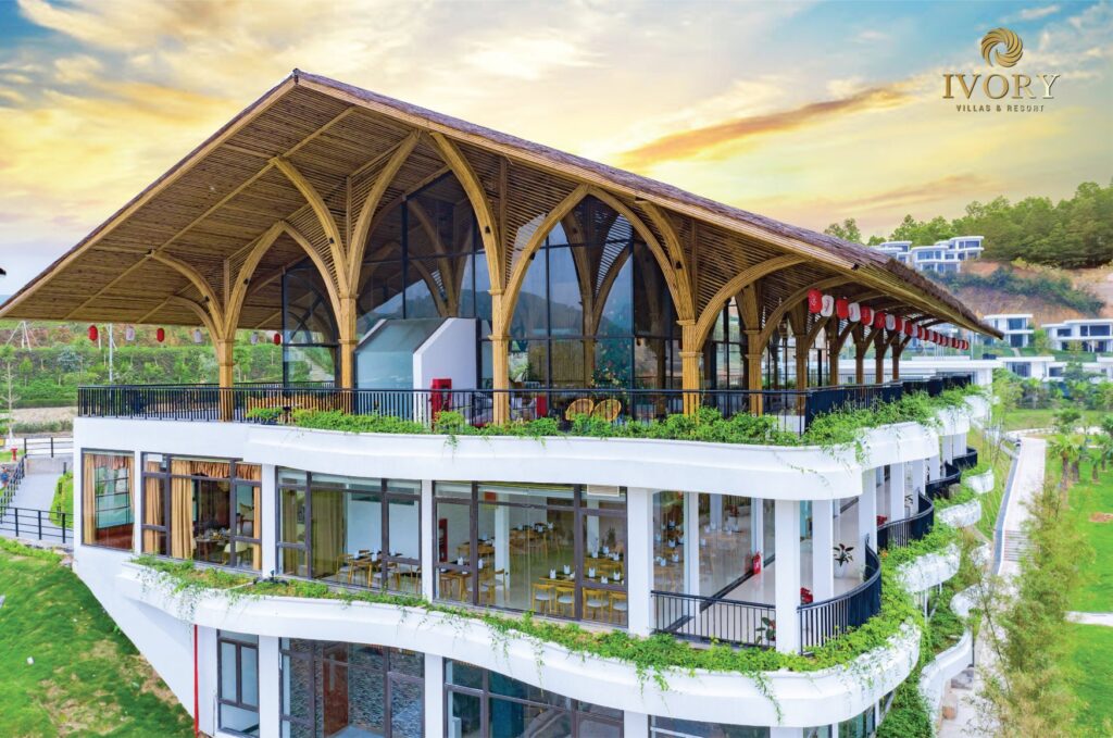 Theo đó, quần thể kiến trúc của Ivory Villas & Resort có định hướng tạo hình theo hình ảnh ngà voi với màu trắng ngà chủ đạo, kết hợp với âm hưởng huyền sử gợi nhớ về “chúa Mường” trên đất Hòa Bình xưa. Cùng đó, với cảm hứng ruộng bậc thang Tây Bắc, các dãy biệt thự được xây giật cấp nương theo địa hình tự nhiên một cách hòa hợp, tạo nên mạch kết nối liên hoàn.