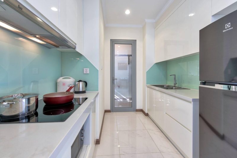 - Bếp: tủ lạnh lớn, lò vi sóng, ấm đun nước cùng với dụng cụ nấu ăn, bộ bữa tối đầy đủ và ly.