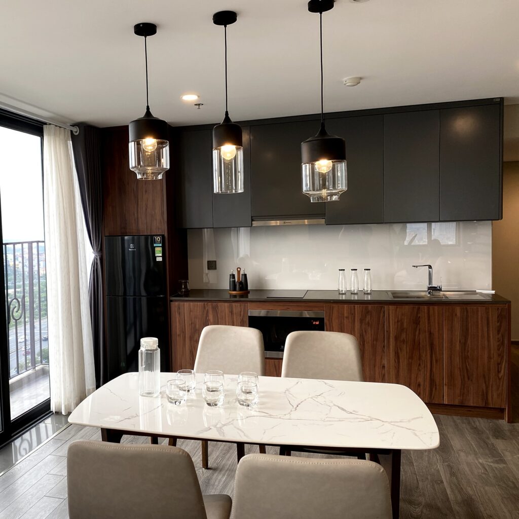 - Diện tích: rộng rãi . Bếp nấu ăn riêng trong từng căn hộ với đầy đủ tiện nghi như bếp nấu, lò vi sóng, tủ lạnh, bát đũa, v.v…)