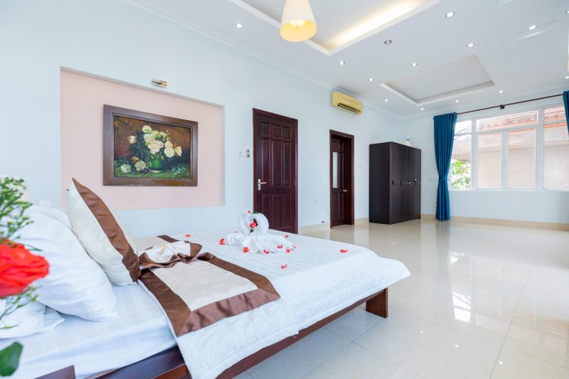 – Thiết kế: Diện tích rộng với phòng khách, 06 phòng ngủ, phù hợp cho đoàn từ 15 đến 20 người, đồ nội thất cao cấp, sang trọng tiêu chuẩn khách sạn;5 phòng tắm đầy đủ khăn và đồ dùng cá nhân, với bồn tắm và tắm đứng.