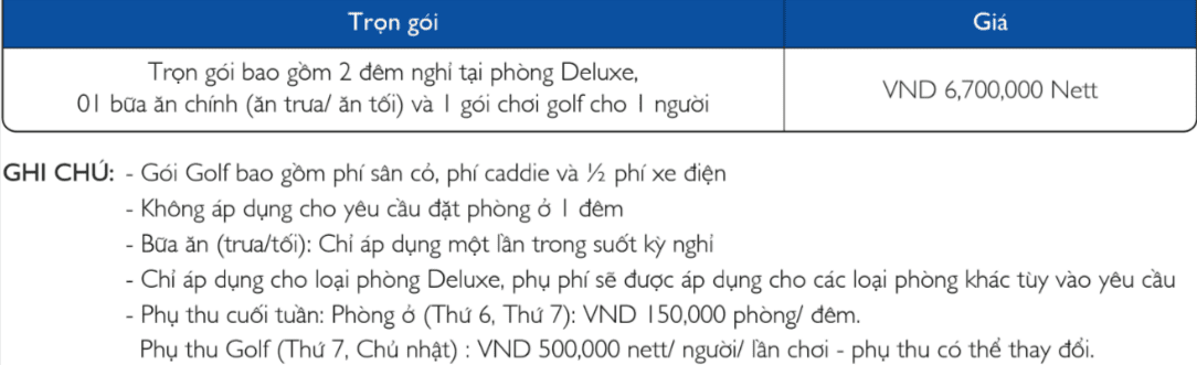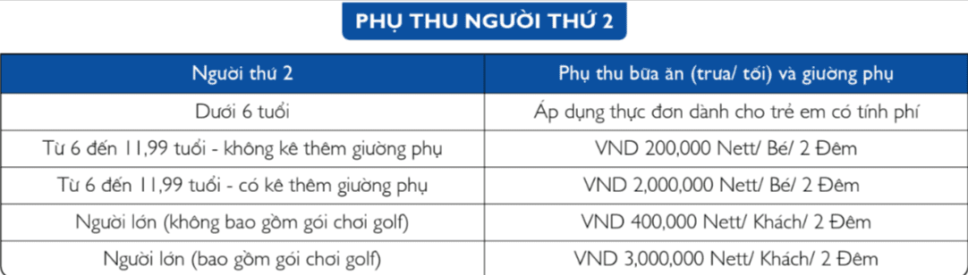 – Cho gói Golf và Stay & Play: từ đêm phòng thứ 3, giá phòng áp dụng theo chương trình Một điểm đến cho mọi nhu cầu.