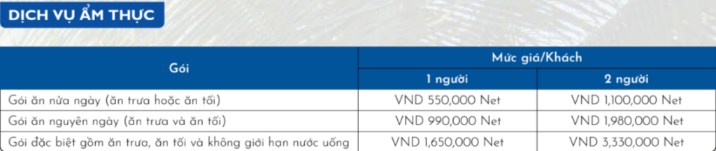 Bữa ăn (trưa/tối) chỉ áp dụng 01 lần trong suốt kỳ nghỉ