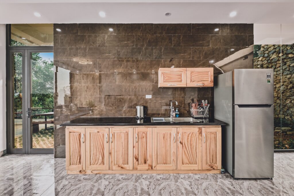 - Bếp trong nhà đầy đủ tiện nghi và bàn ghế tiệc nướng bbq ngoài trời.