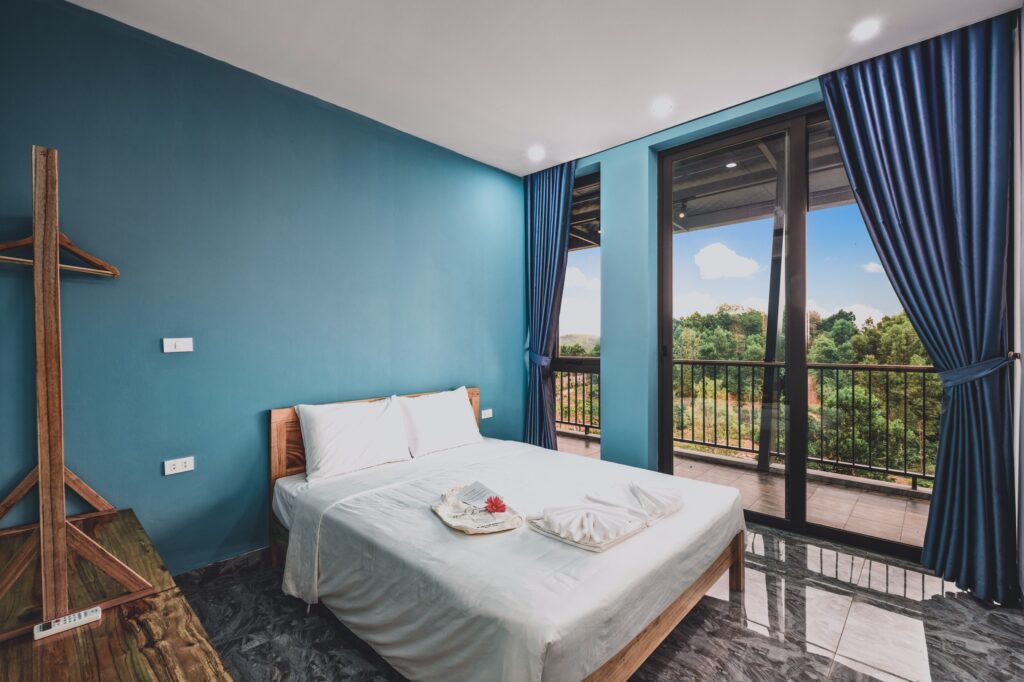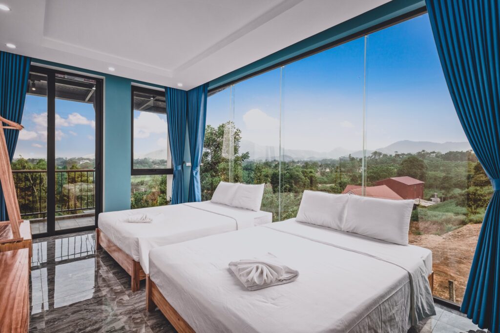 - Thiết kế 2 tầng gồm 2 phòng ngủ: mỗi tầng 1 phòng ngủ mở view kính hướng ra đồi thông.