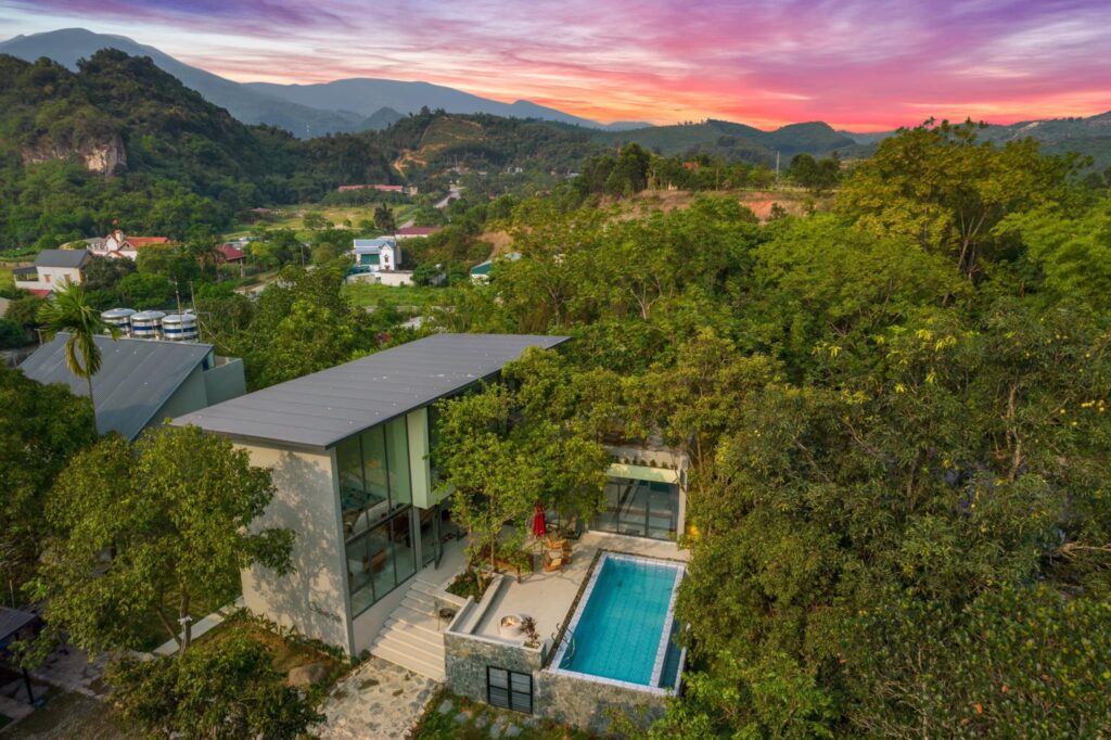“Đèn mây trắng” villa Hồ Dụ, Hoà Bình 3 phòng ngủ- Biệt thự đẹp có bể bơi riêng vô cực, cho thuê du lịch