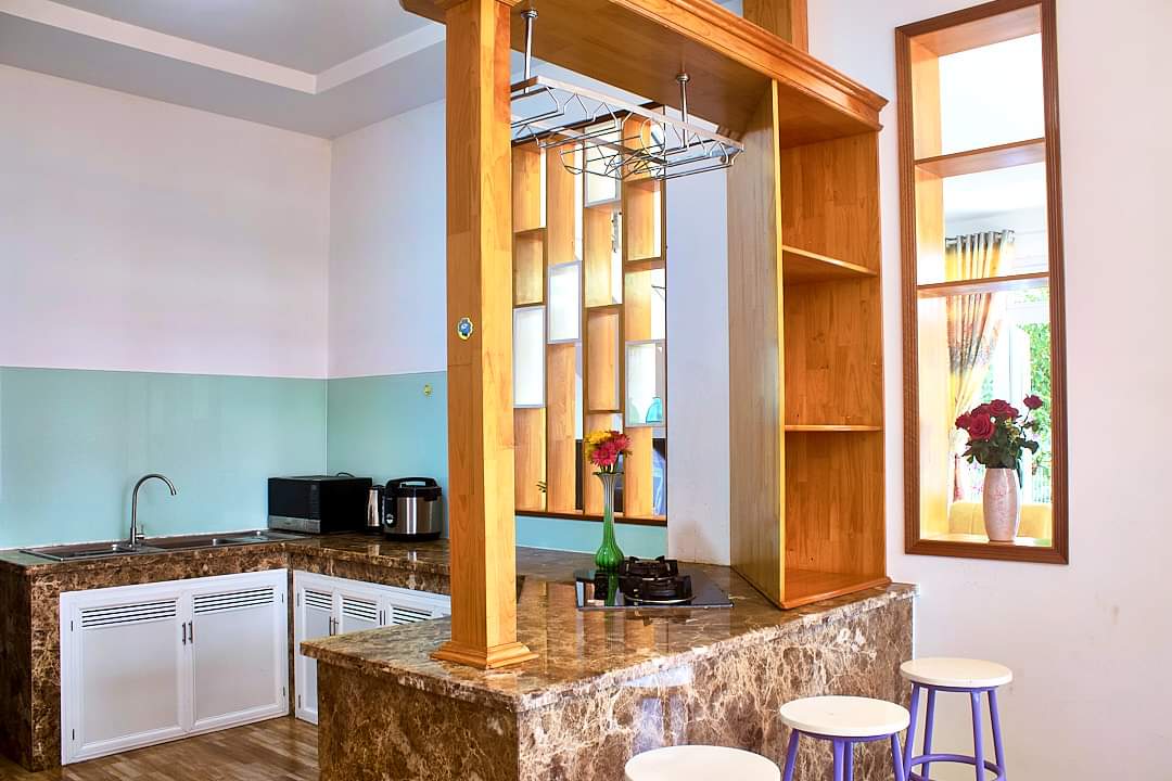- Tầng trệt bao gồm phòng khách, phòng ăn rộng rãi cùng bếp to đầy đủ dụng cụ nấu ăn và toilet ngay cạnh