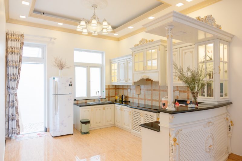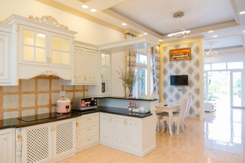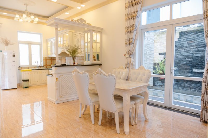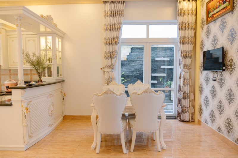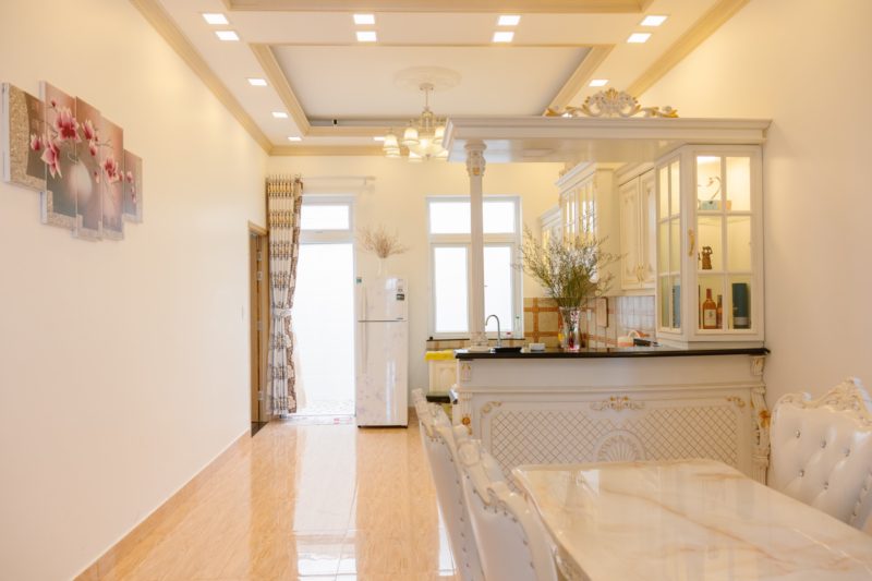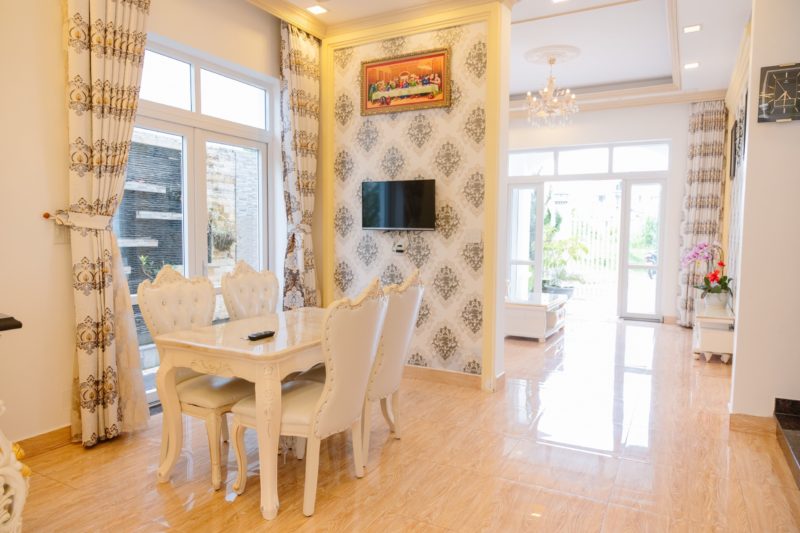 - Phòng khách, không gian bếp nấu với đầy đủ dụng cơ bản phục vụ nấu nướng. Bàn ăn.