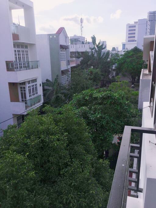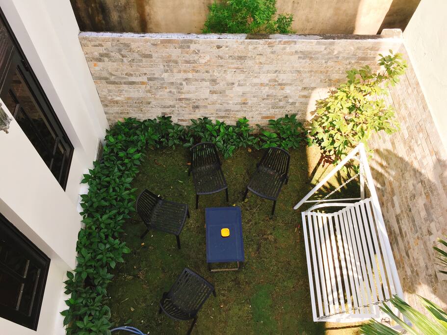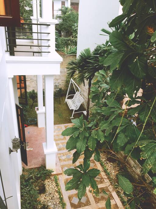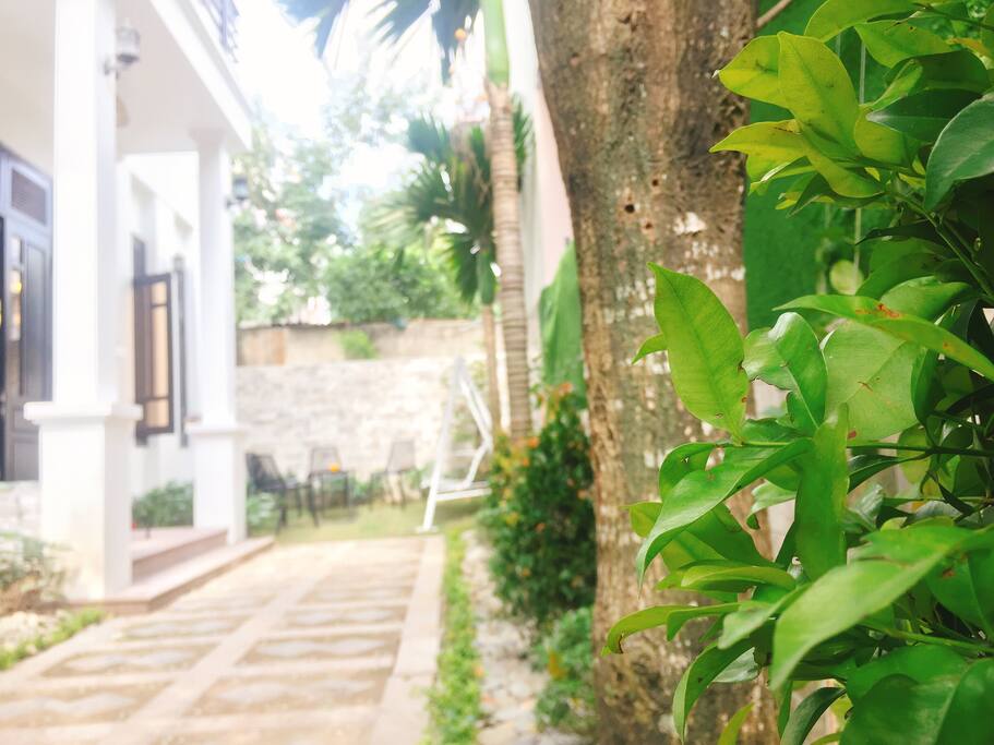 Đứng bên ngoài nhìn vào ngôi nhà, bạn sẽ cảm thấy vô cùng thoải mái khi ở sân và nhiều cây xanh. không khí rất trong lành, rất thích hợp để thư giãn.