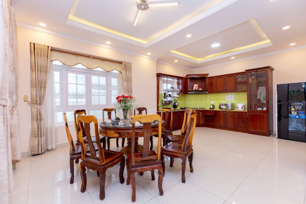 Có thiết kế hiện đại kết hợp những gam màu ấm nóng giúp cho bạn có cảm giác ấm cúng khi nghỉ dưỡng tại đây. Tuy nhiên do gần chợ nên diện tích sân vườn của căn nhà là không được rộng rãi.