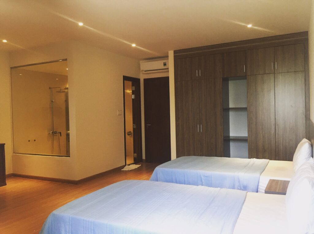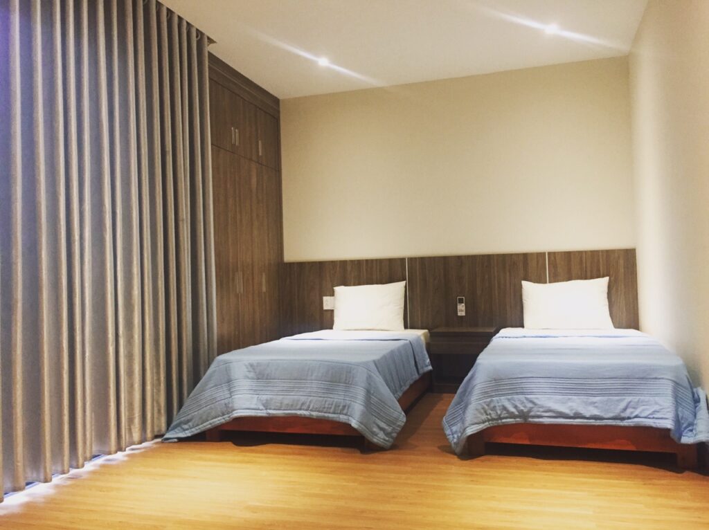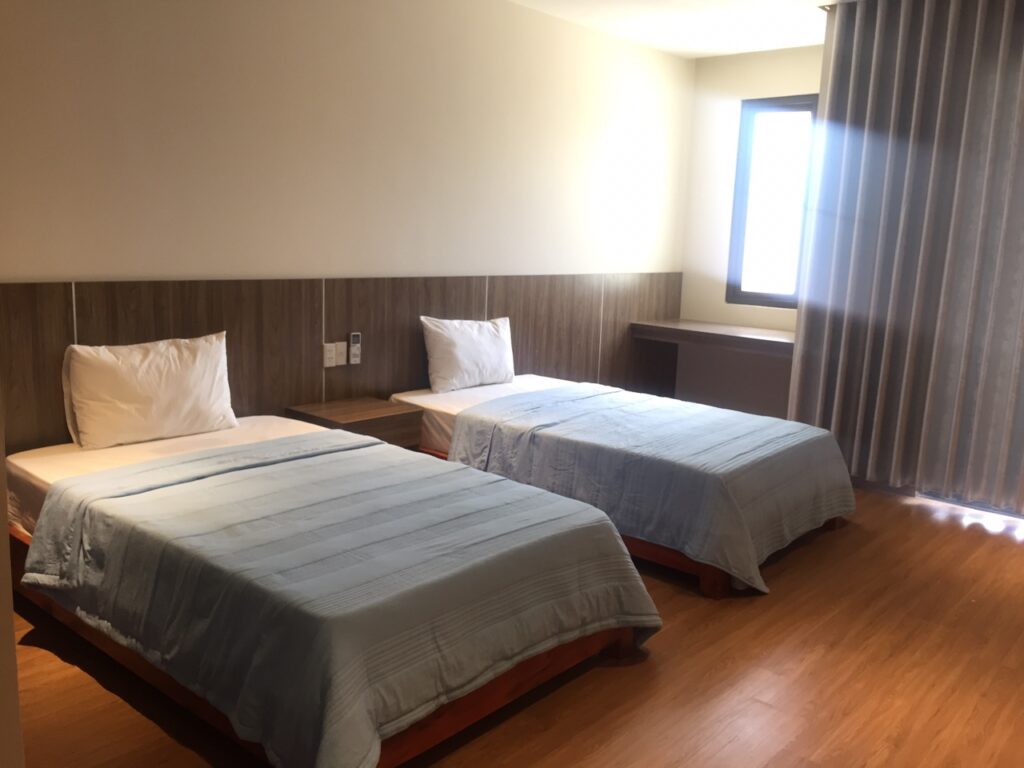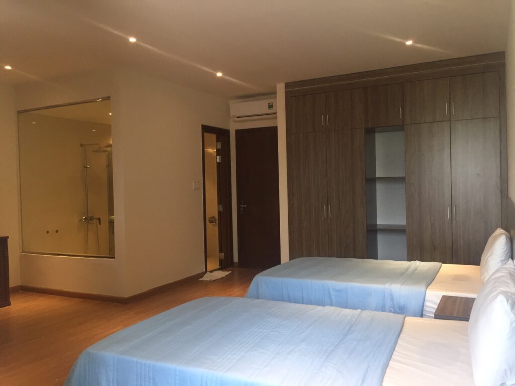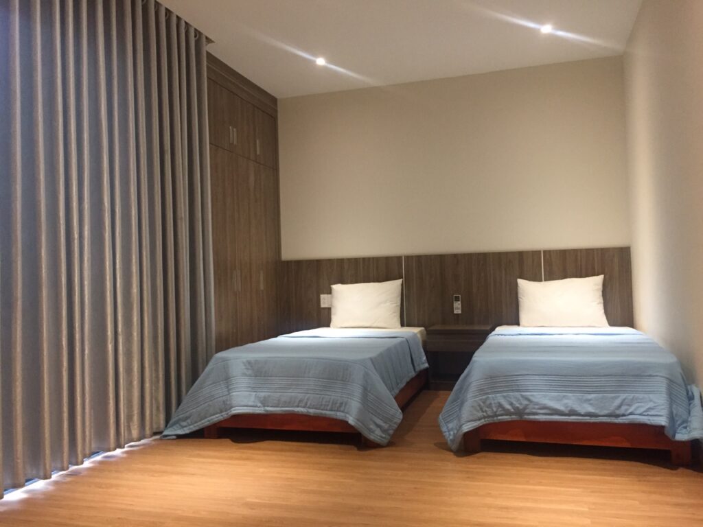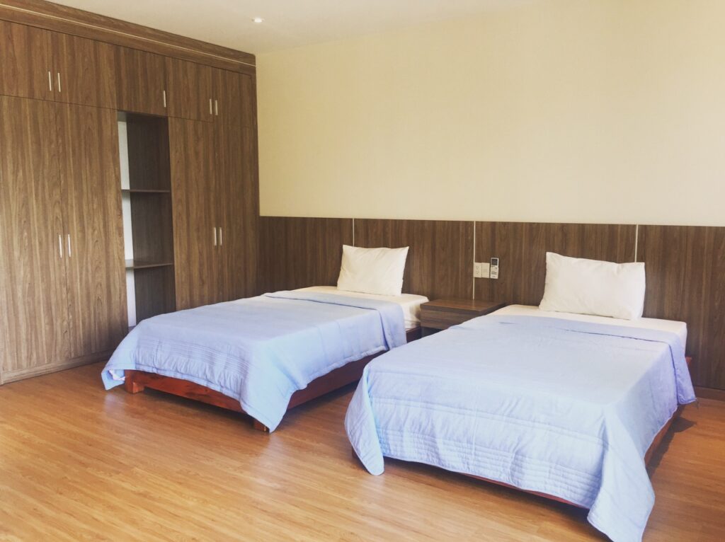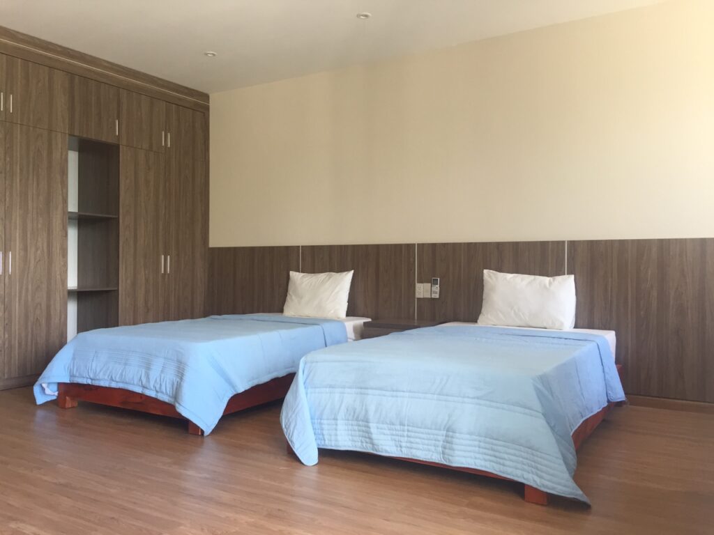– 5 phòng ngủ mỗi phòng có 2 giường 1m2 có thể ghép thành 1 giường lớn.
