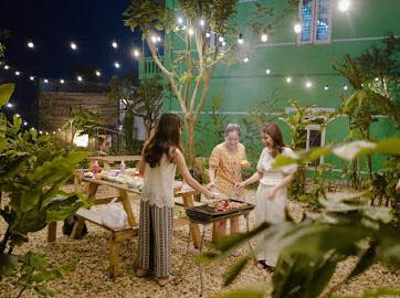 – Sân vườn bbq riêng: bàn ghế gỗ quây quần quanh bếp than hồng