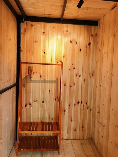 – Phòng thay đồ: kệ gỗ treo đồ, gương gỗ với vài chiếc móc treo đồ bằng gỗ tự chế nhỏ xinh