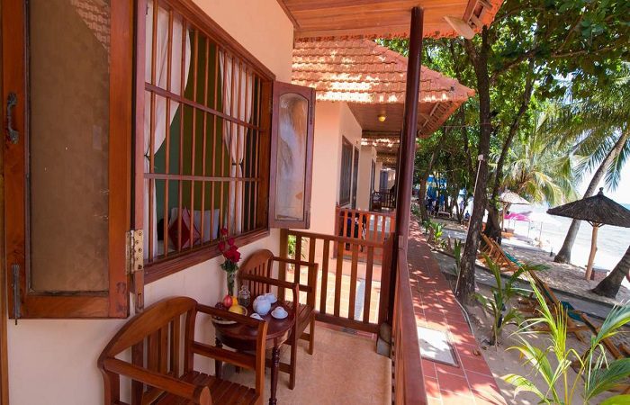 – Bungalow trên biển: 28m2, có 1 giường đôi lớn, 2 khách, nằm ngay trên bãi biển, có ban công, máy lạnh, tủ lanh, phòng tắm riêng…