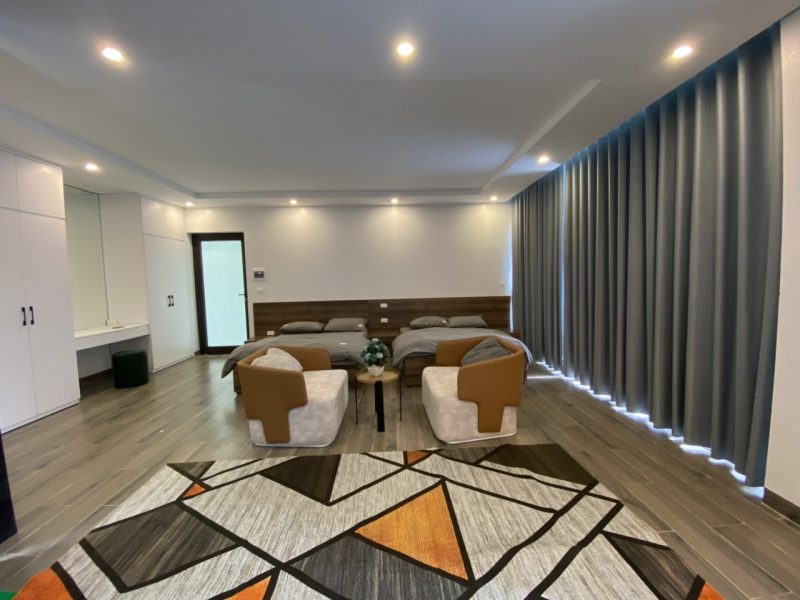 - Nguyên căn 5 phòng ngủ vệ sinh khép kín trong đó : 3 phòng đơn mỗi phòng 1 giường 1m8*2m, 2 phòng 2 giường 1m8*2m