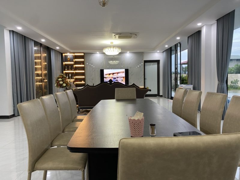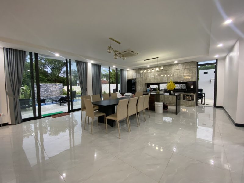 - Villa trang bị bàn ghế ăn ngoài trời ( 15-30 người). Villa có liên kết một số nhà hàng đặt đồ ăn