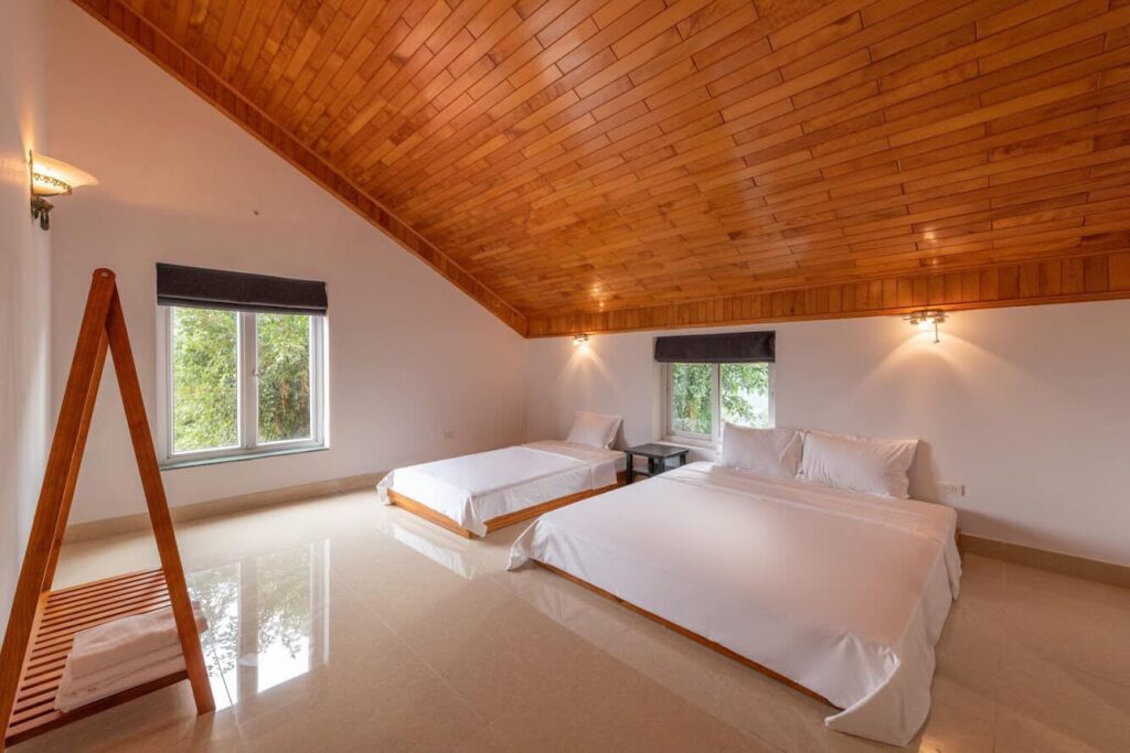 – 1 Phòng ngủ lớn áp mái (2 giường đôi + 3 giường đơn + 1 đệm dự phòng)