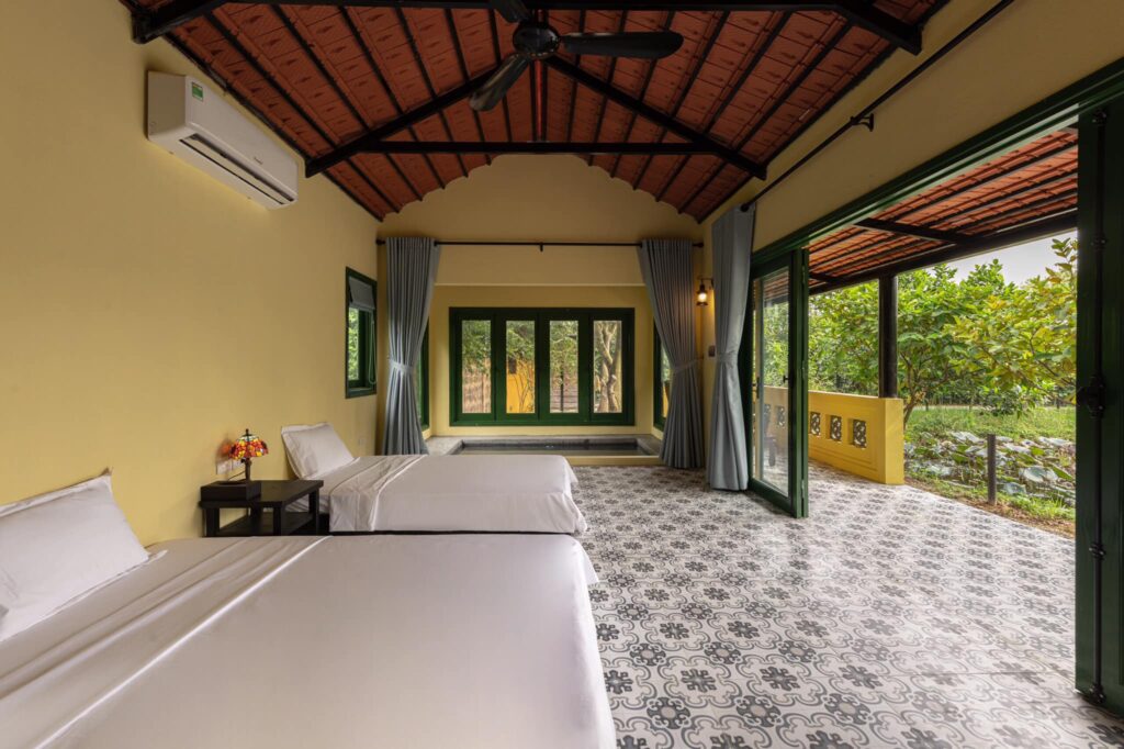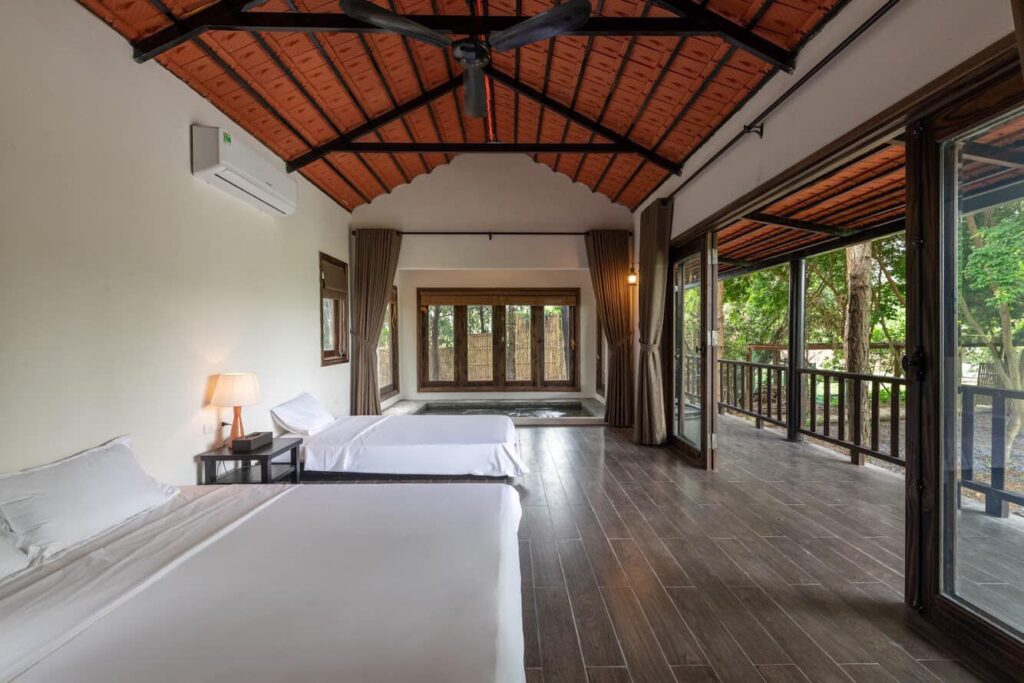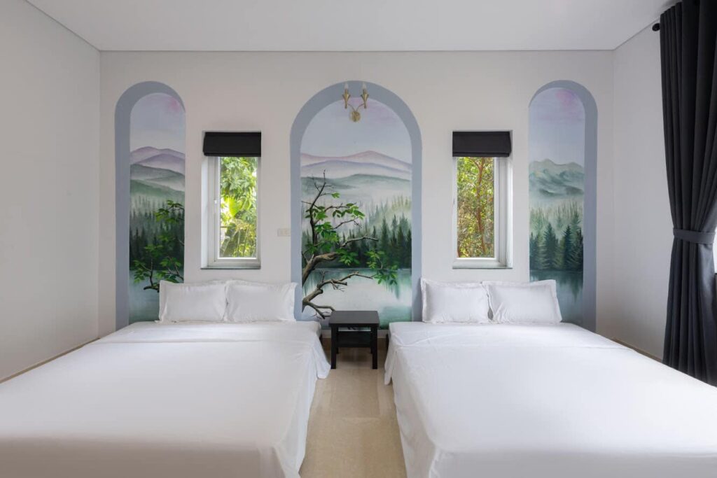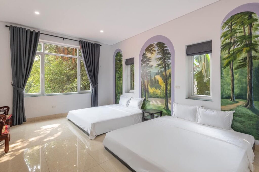 – 2 Phòng ngủ gia đình (2 giường đôi + 1 đệm dự phòng) với chăn ga gối cao cấp kèm khăn tắm
