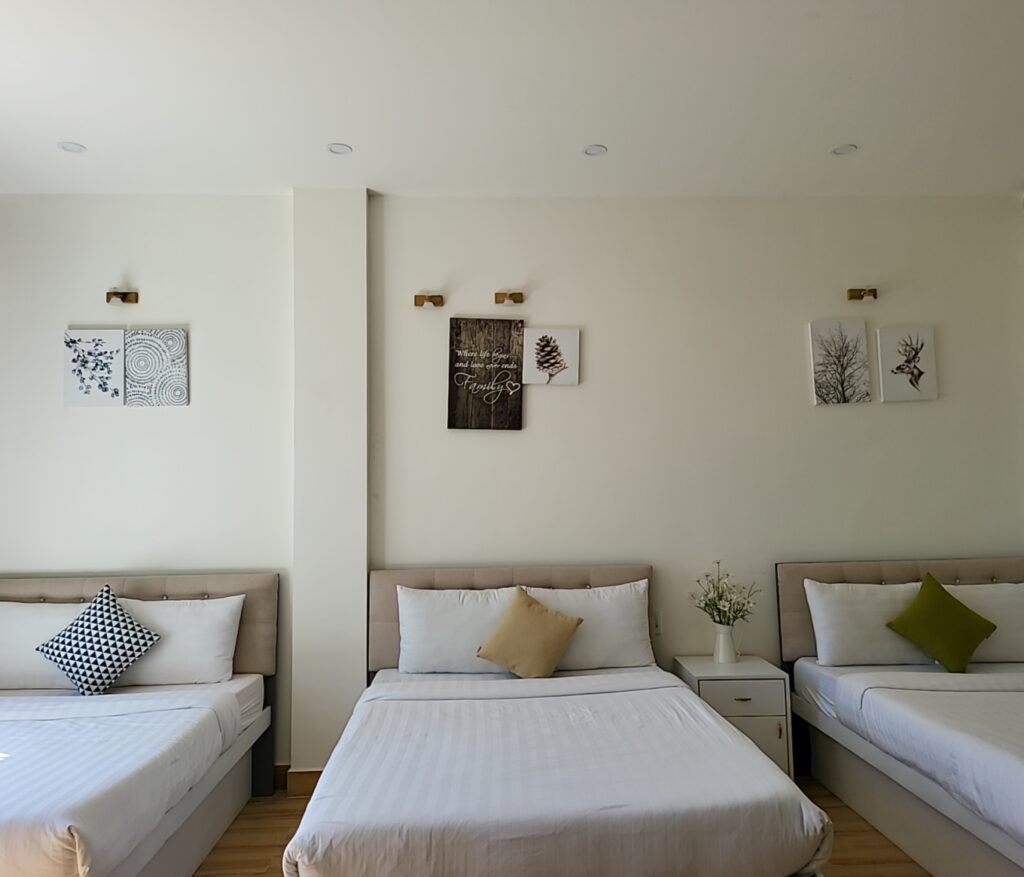 - 5 phòng ngủ : 1 phòng 3 giường, 1 phòng 2 giường, 2 phòng đơn, 1 áp mái rộng nhưng chỉ để 2 nệm