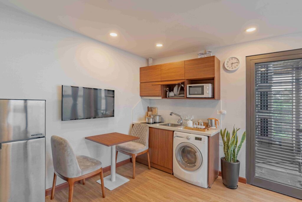 - Được trang bị đầy đủ nội thất, dụng cụ nấu nướng, máy giặt, sấy, đồ vệ sinh cá nhân.