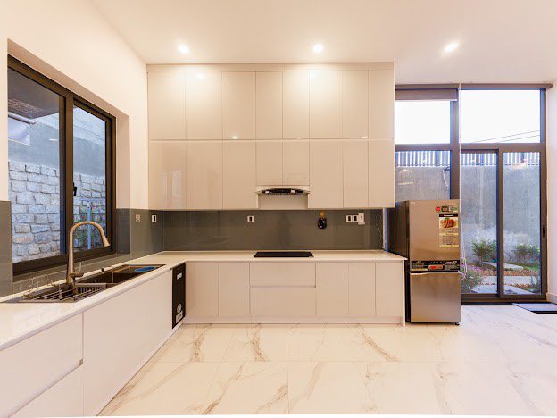 Phòng khách, bếp, sang trọng đầy đủ tiện nghi, khoảng sân rộng tươi mát tạo cảm thư giãn cho du khách và tổ chức tiệc BBQ thoải mái.