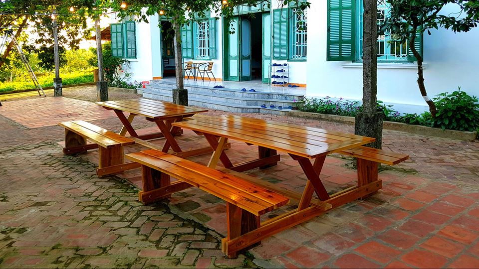 – Khu vực nhà chòi view hồ có bàn ghế gỗ