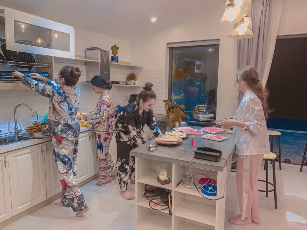 - Bếp trong nhà đầy đủ dụng cụ ( bếp lẩu, bếp nướng điện, bếp điện và bát đũa cốc chén đầy đủ)