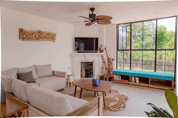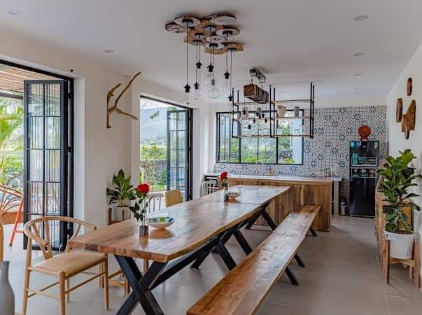 – Phòng khách thiết kế mở, được nối liền với bếp. Gồm 1 bàn ăn chung cho 15-20 người và khu vực sofa uống trà nhìn ra cánh đồng và núi xanh ngát.