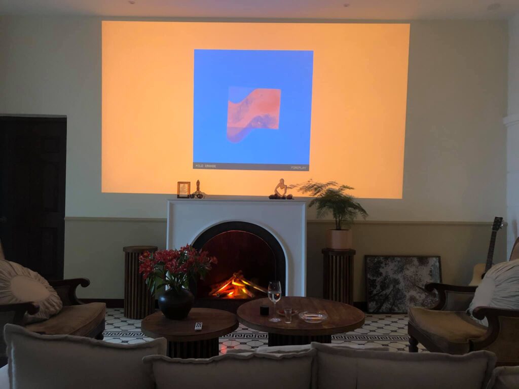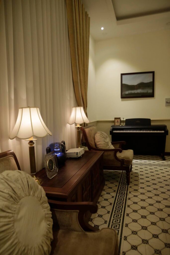 – Phòng khách với các loại nhạc cụ, được trang bị máy chiếu full HD, có thể xem Netflix, Youtube cùng dàn âm thanh Harman Kardon.