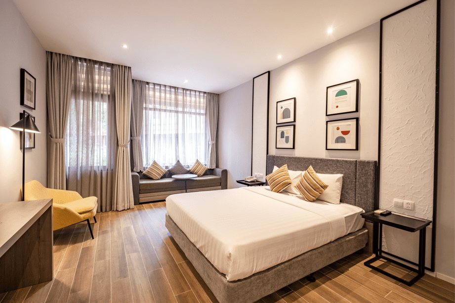 113 phòng khách sạn với thiết kế tối giản pha lẫn nét hiện đại tạo nên không gian mở với view vườn xanh mát dễ dàng giúp nối kết thiên nhiên với các thành viên thêm gần gũi. Tone màu trắng tinh khôi và gỗ ấm áp là khởi đầu cho một kỳ nghỉ chất lượng