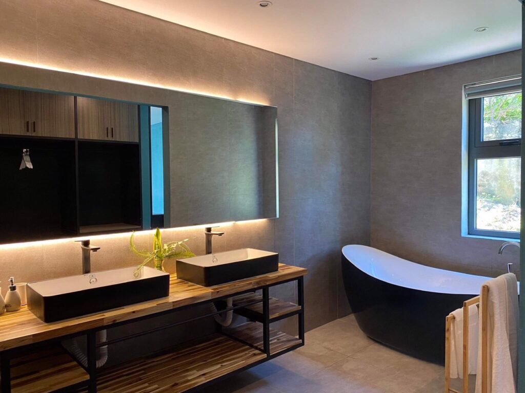 - Tầng 1 gồm 3 phòng khép kín giường 1m8 ( 1 phòng có bồn tắm )