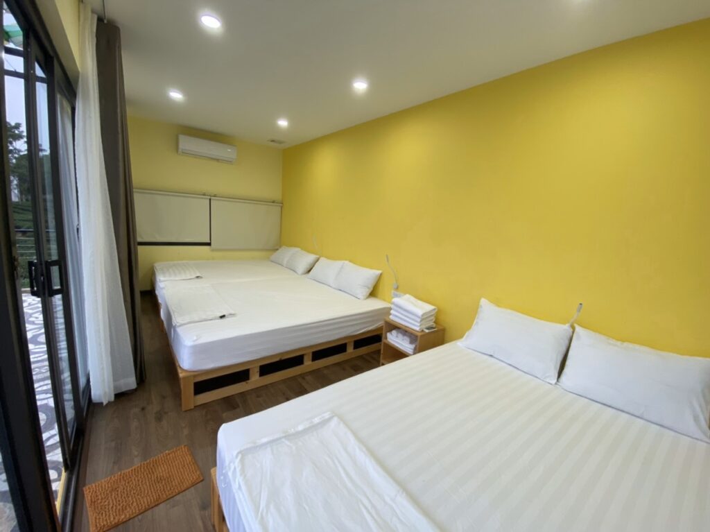 – 1 phòng ngủ tập thể 03 giường view ban công thoáng mát từ đó có thể nhìn xuống hồ câu và bể bơi, 1 nhà vệ sinh chung cùng đầy đủ chăn ga gối đệm dự phòng.