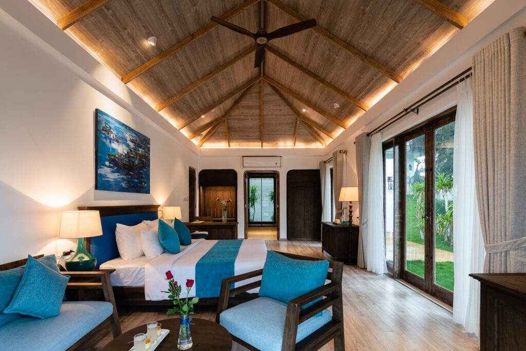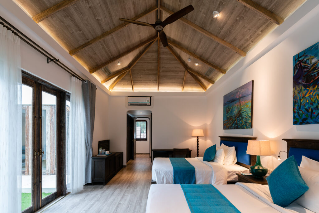– Two Bedroom Villa with Garden View: Thiết kế mở tinh tế và hài hòa với thiên nhiên, hai phòng ngủ sang trọng, riêng biệt nổi bật với những bức tranh trên tường thể hiện nét đẹp thiên nhiên và văn hóa bản địa, kết nối cùng phòng khách ấm cúng ở giữa tạo không gian chung cho cả gia đình quây quần trò chuyện, thư giãn. Khu vườn xanh mướt với bãi cỏ rộng là nơi lý tưởng cho các hoạt động ngoài trời hay cùng tổ chức tiệc BBQ vui vẻ, mang mọi người đến gần nhau hơn, lan tỏa nguồn năng lượng yêu thương. Giá chỉ từ 5.984.000 VNĐ/đêm.