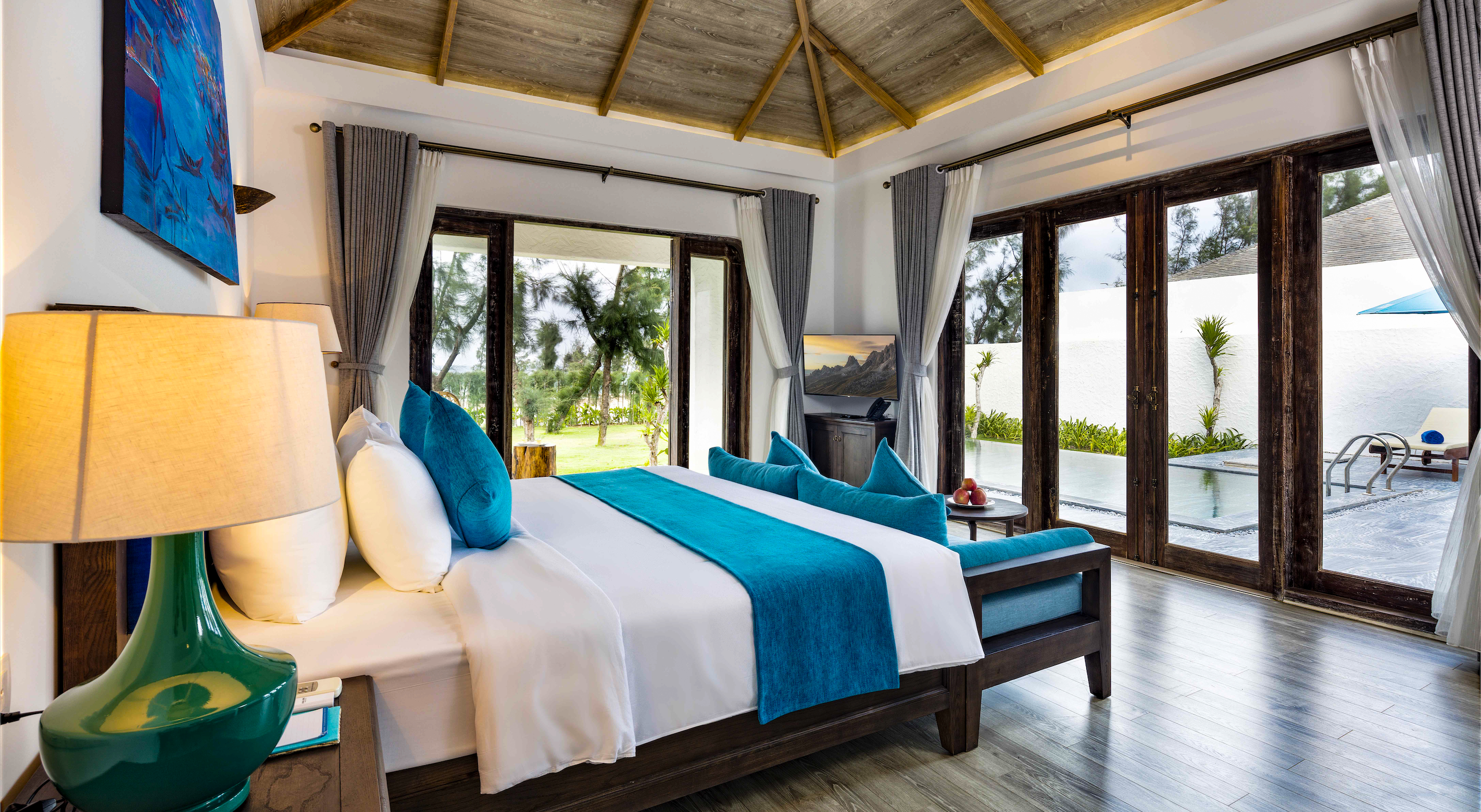 – One Bedroom Pool Villa with Ocean View: Căn biệt thự sang trọng, riêng tư với thiết kế đương đại, kết nối phòng khách và phòng ngủ có hướng nhìn ra hồ bơi riêng, khu vườn xanh và đại dương bao la. Thảnh thơi bơi lội, tắm nắng, đắm mình trong ánh hoàng hôn bên ly cocktail đầy hương vị hay thưởng thức bữa tiệc tối ngoài trời cùng gia đình sẽ là những trải nghiệm đáng nhớ cho du khách. Giá chỉ từ 5.310.000 VNĐ/đêm.
