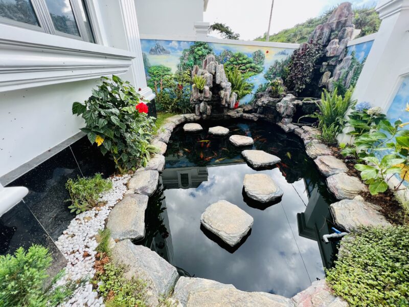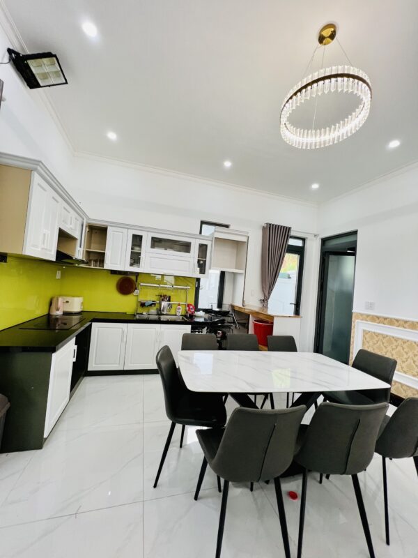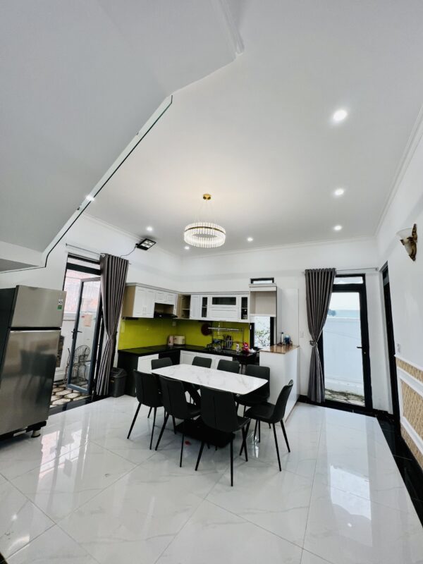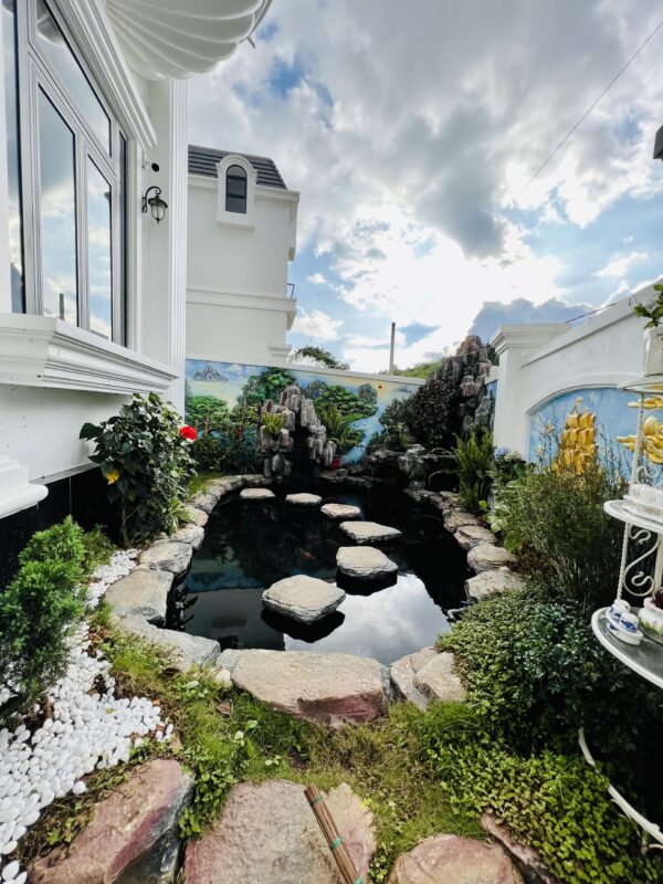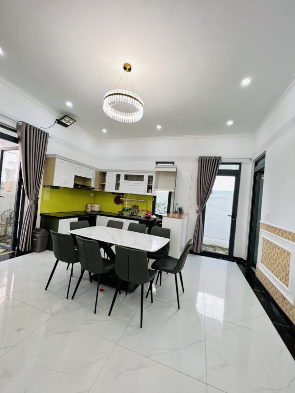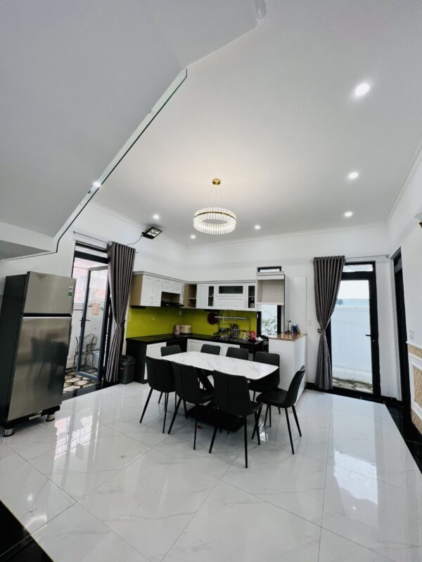 Phòng khách, bếp, sang trọng đầy đủ tiện nghi, khoảng sân rộng tươi mát với hồ cá Koi tạo cảm thư giãn cho du khách và tổ chức tiệc BBQ thoải mái.