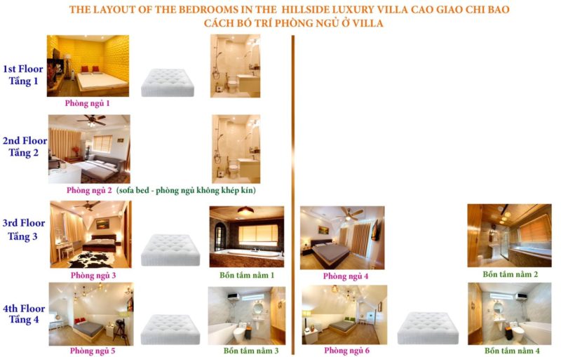 +Villa có tổng cộng 5 phòng ngủ: có 5 giường, có thêm 4 nệm để trải thêm trong các phòng nếu đoàn đông, có 1 sofa bed ở phòng khách ở tầng 2.