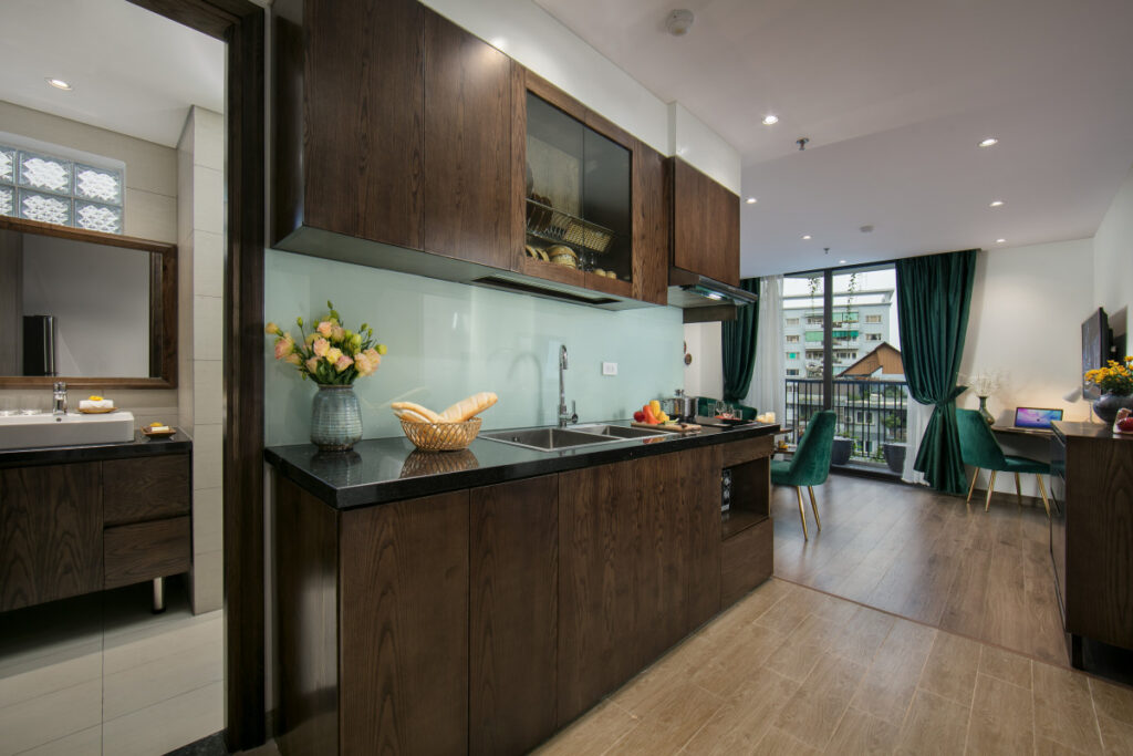 Nếu bạn muốn tự chuẩn bị cho bạn những món ăn phù hợp với khẩu vị thì The Bloom Hà Nội chính là một lựa chọn hoàn hảo. Khu vực bếp của căn hộ được trang bị bếp từ an toàn, lò vi sóng, tủ lạnh lớn cùng bộ dụng cụ nấu ăn, chén đĩa đầy đủ cho gia đình. Ngoài ra, khu vực xung quanh khách sạn tập trung rất nhiều nhà hàng, quán ăn Âu, Á, Việt…