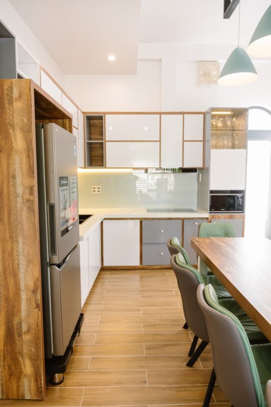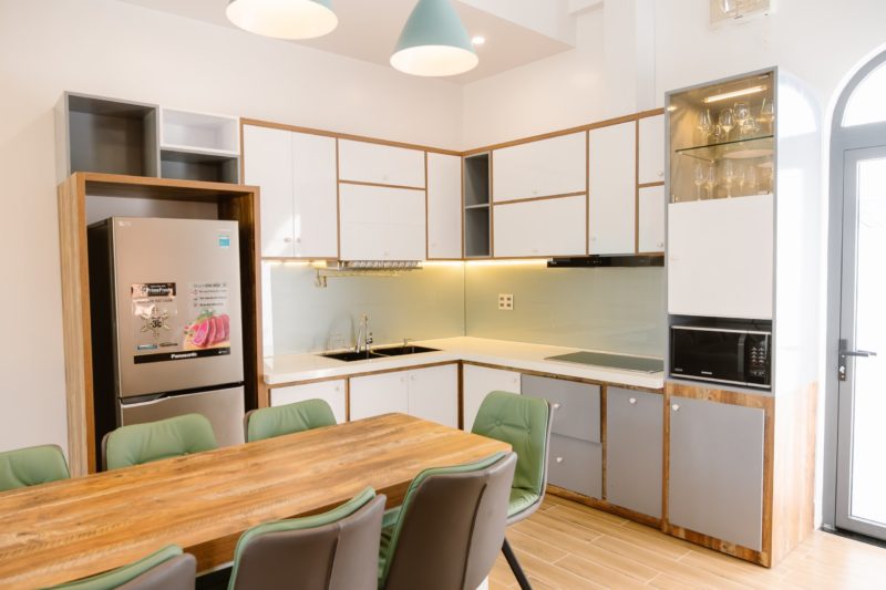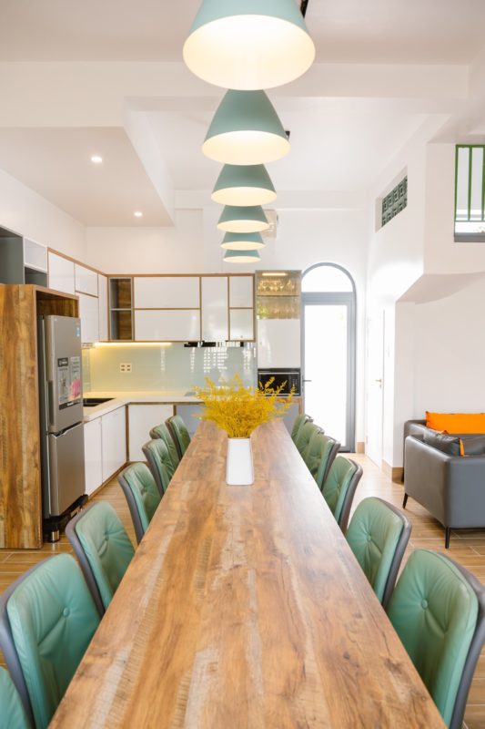 - Không gian Bếp thông với phòng khách một không gian chung mang đến sự kết nối cho quý khách khi có thể nấu nướng tại villa miễn phí, với đầy đủ dụng cụ nấu ăn, lò vi sóng, nồi chiên không dầu, ly rượu vang…cùng các vật dụng cơ bản khác. Bàn ăn được thiết kế sang trọng với 1 bàn dài + 20 ghế cao cấp.