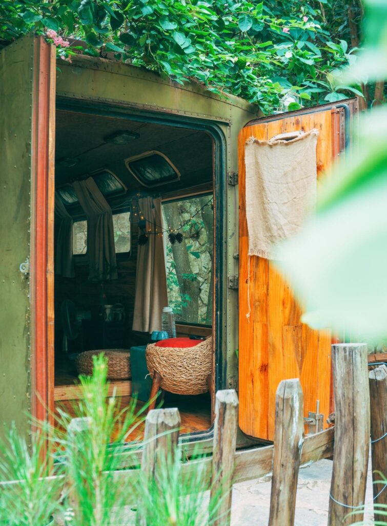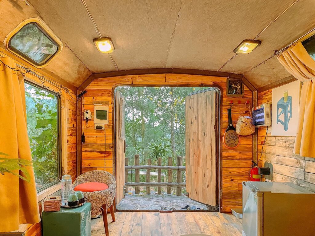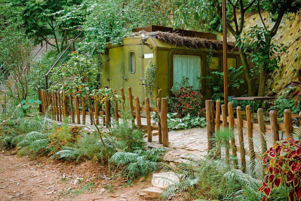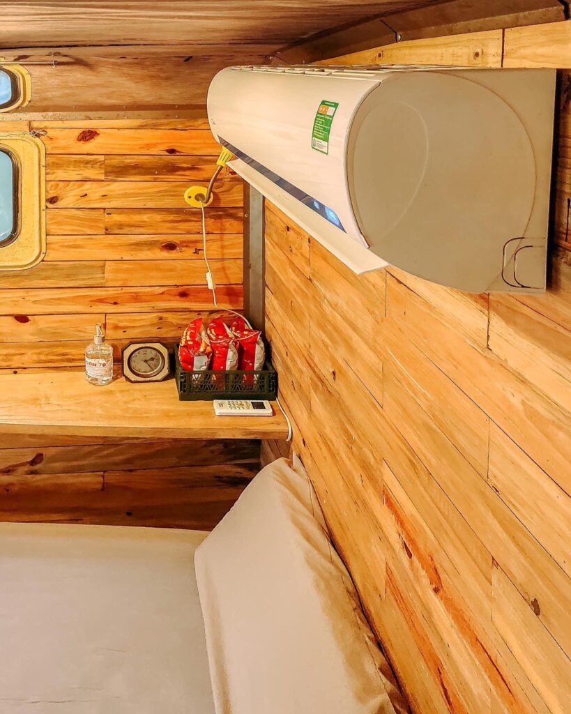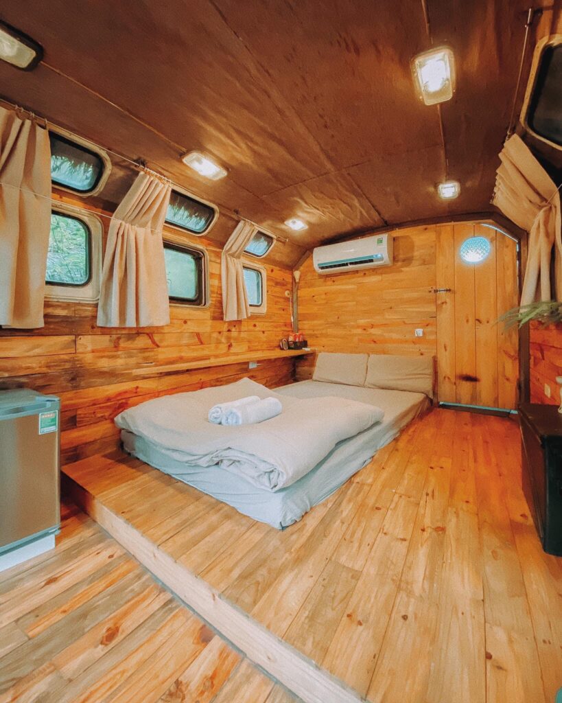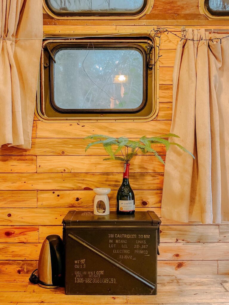 - Thùng sắt 1 được tái chế bằng xe quân sự đã được nâng cấp toán bộ nội thất bên trong thành 1 bungalow tiêu chuẩn với nội thất tiện nghi, trẻ trung nhưng vẫn giữ nguyên chất bụi qua bao năm tháng của vỏ xe.