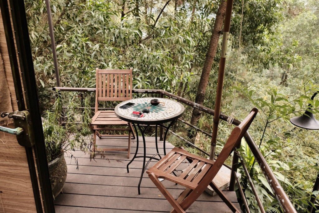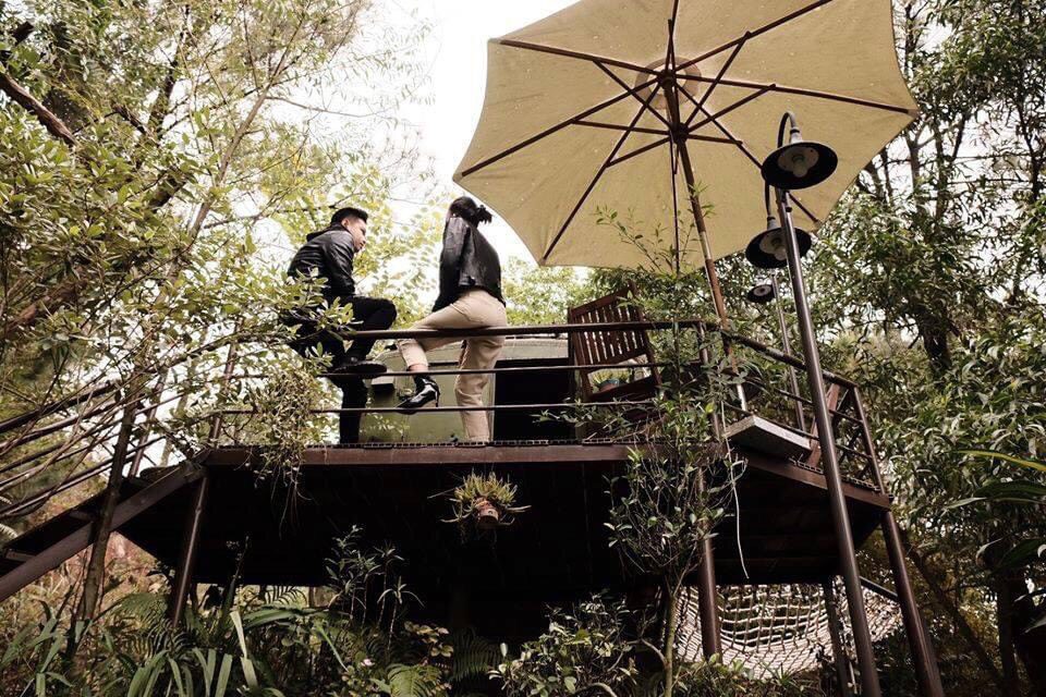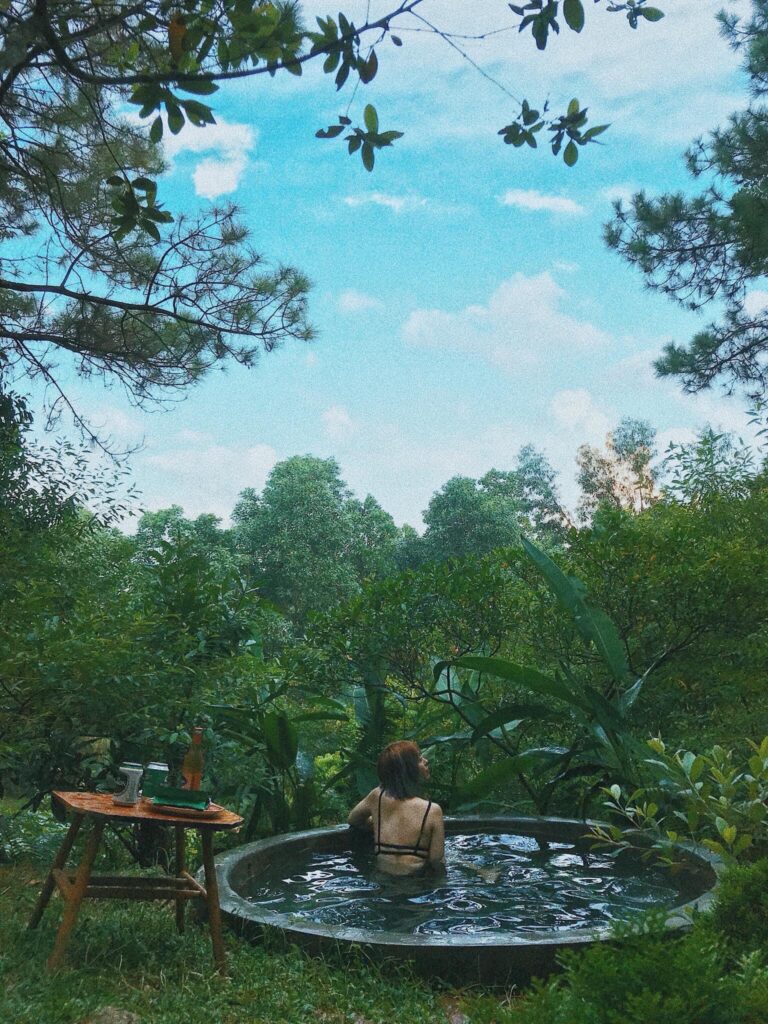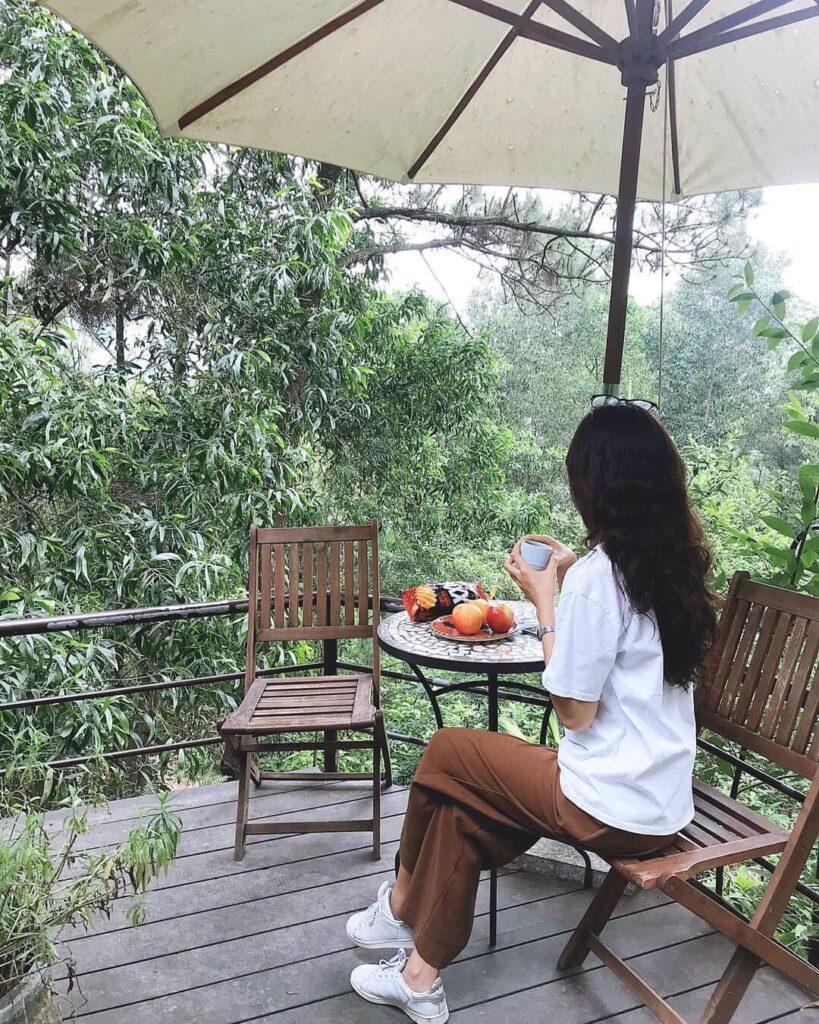 - Một ban công nhỏ xinh đẹp có bàn trà nép dưới tán cây râm mát của cánh rừng có view 360 độ hướng thắng xuống thung lũng phía dưới, cả 1 bể ngâm người trên cao cũng mát mẻ thư thái.