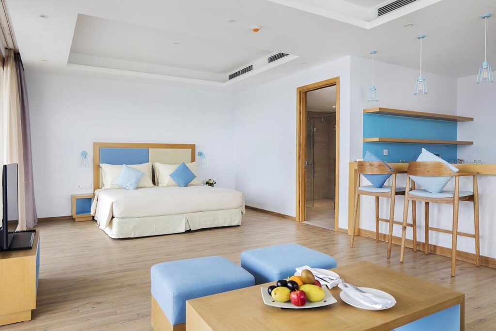 - Studio suite: Diện tích 50m2, tiêu chuẩn 2 người lớn, 1 giường đôi hoặc 2 giường đơn, hướng biển, cabin tắm đứng