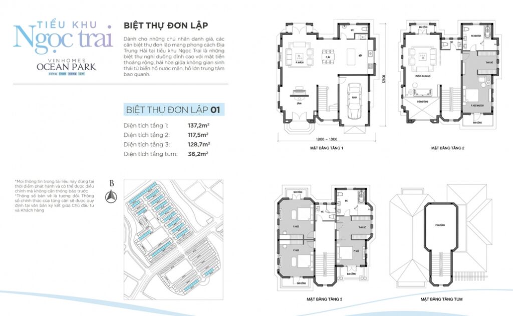 - Biệt thự song lập: diện tích 135 – 338m2; xây dựng 3 tầng nổi và 1 tum.