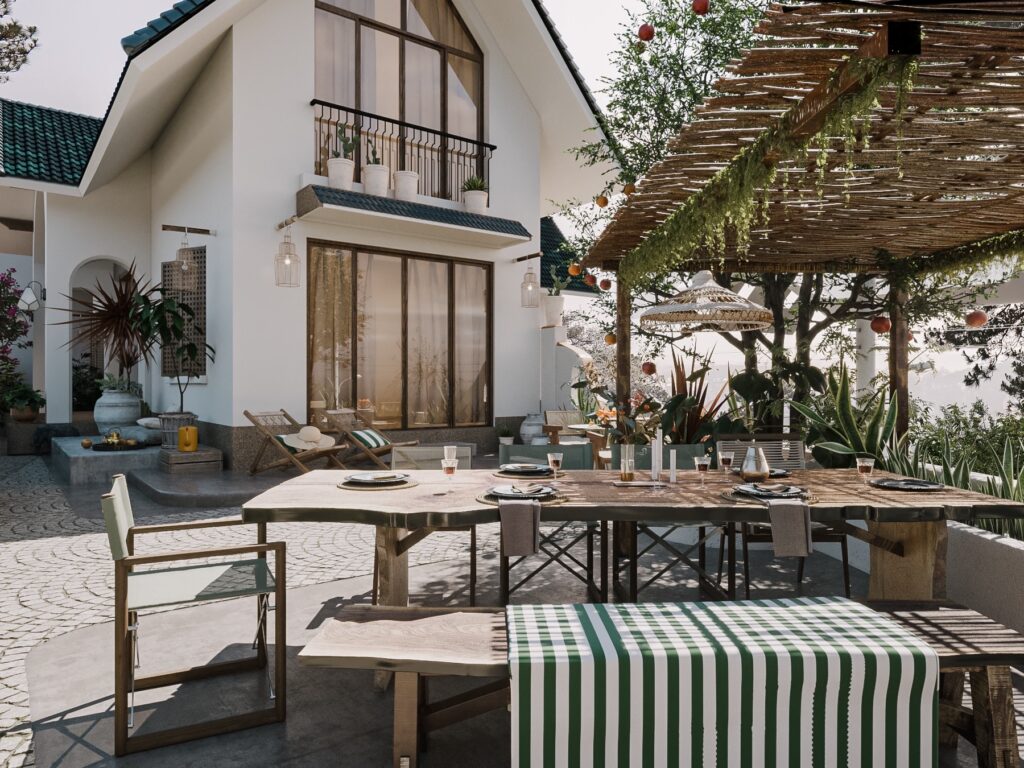– Bên ngoài là khu sân vườn nhỏ tổ chức BBQ. - Giá 10 triệu/đêm cho 16 khách, đi hơn phụ thu 250k/khách/đêm