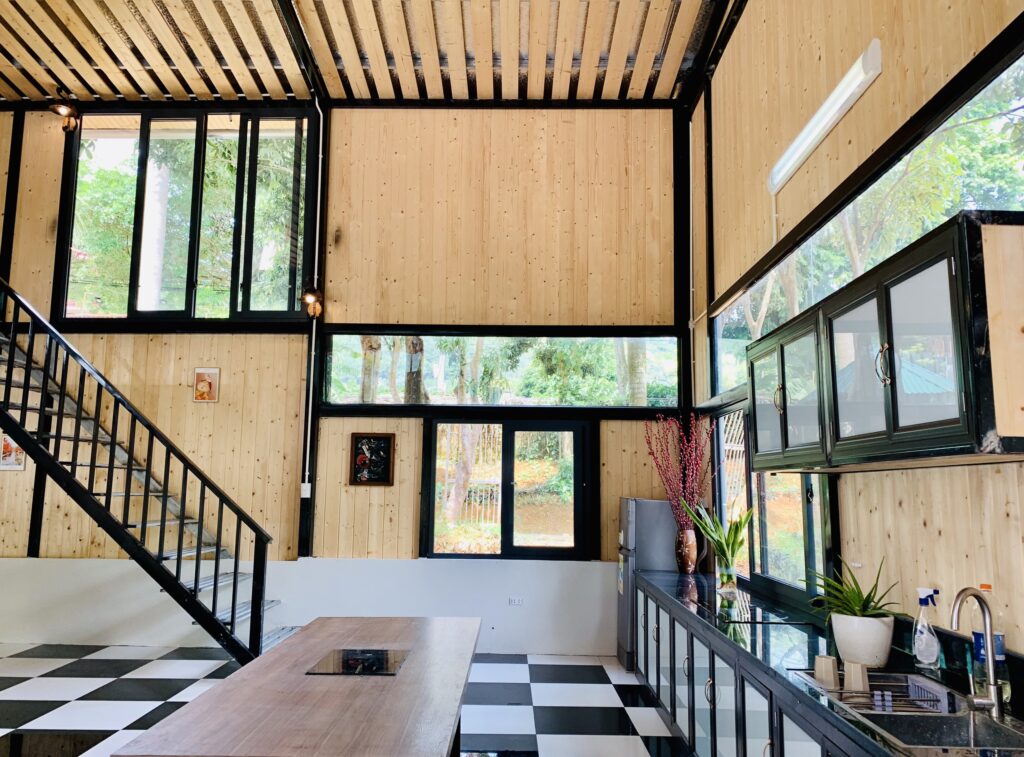 – Khu bếp có: bếp từ, tủ lạnh cùng đầy đủ dụng cụ nấu ăn cơ bản (không có gia vị nấu)