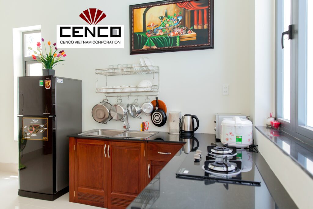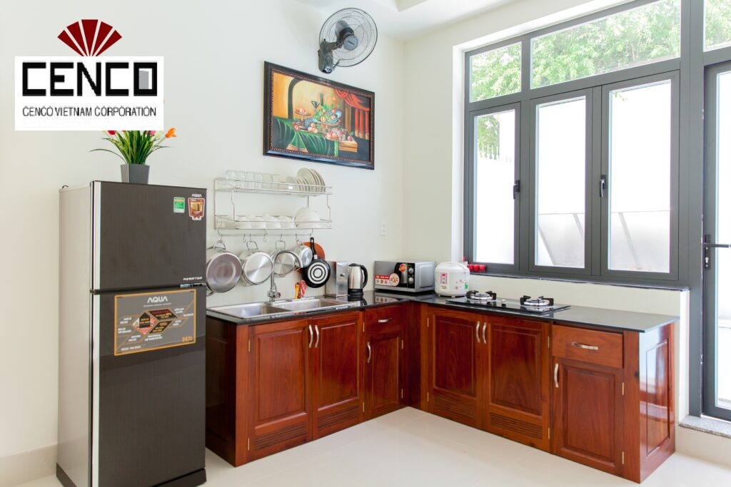 – Phòng bếp hiện đại, đầy đủ đồ dùng nấu bếp: lò vi sóng, lò nướng, nồi cơm điện, bình đun siêu tốc, tủ lạnh, chén bát…